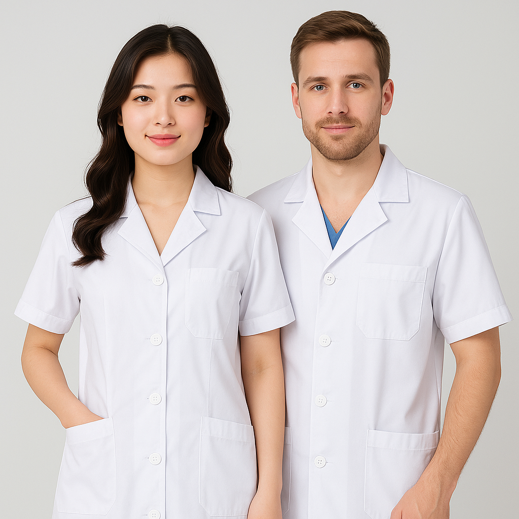Áo blouse trắng dành cho bác sĩ, dược sĩ, sinh viên y – thiết kế chuẩn chỉnh, chất liệu thoáng mát, in/thêu logo, tên khoa, cá nhân hóa theo yêu cầu, phù hợp bệnh viện, phòng khám, trường học.