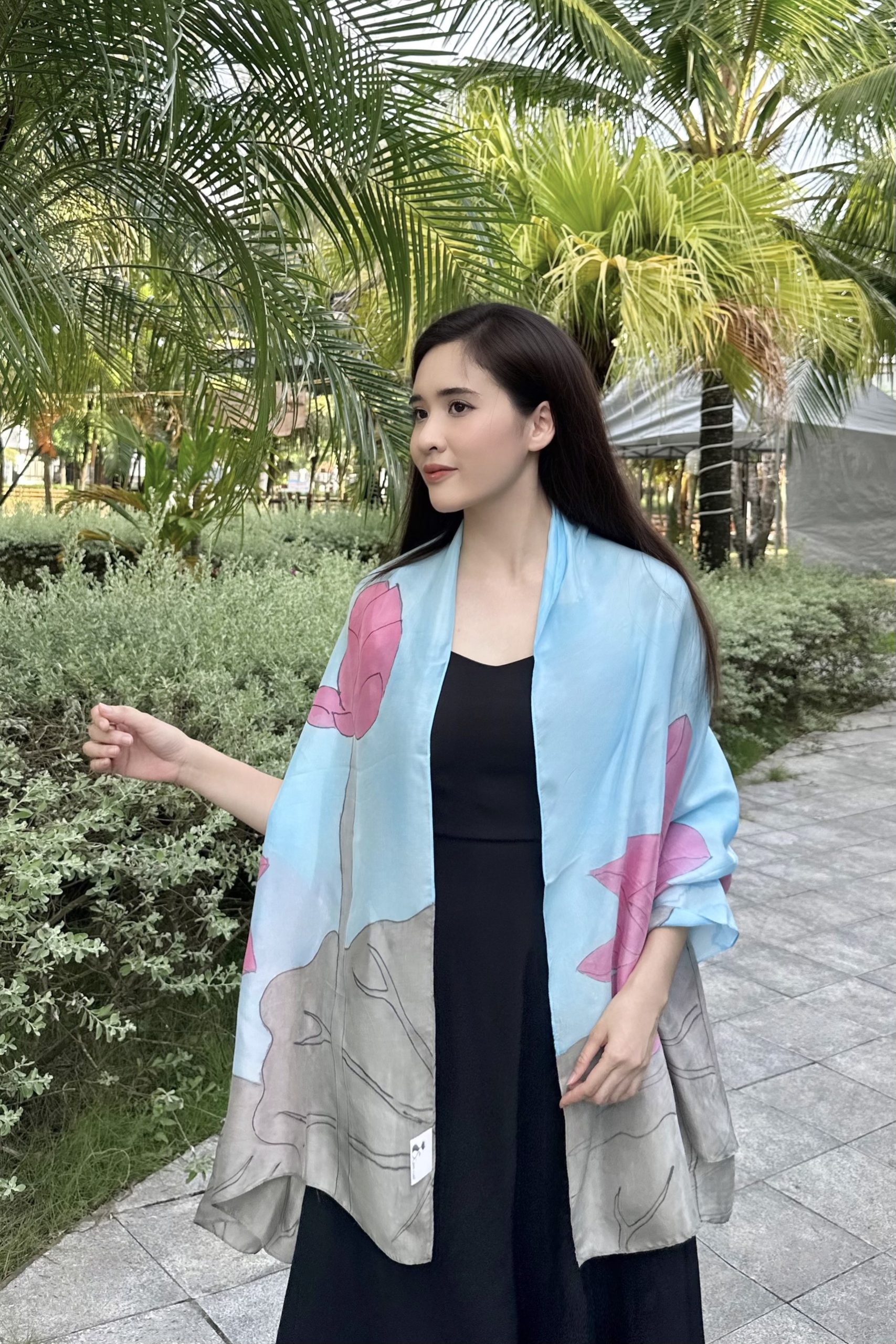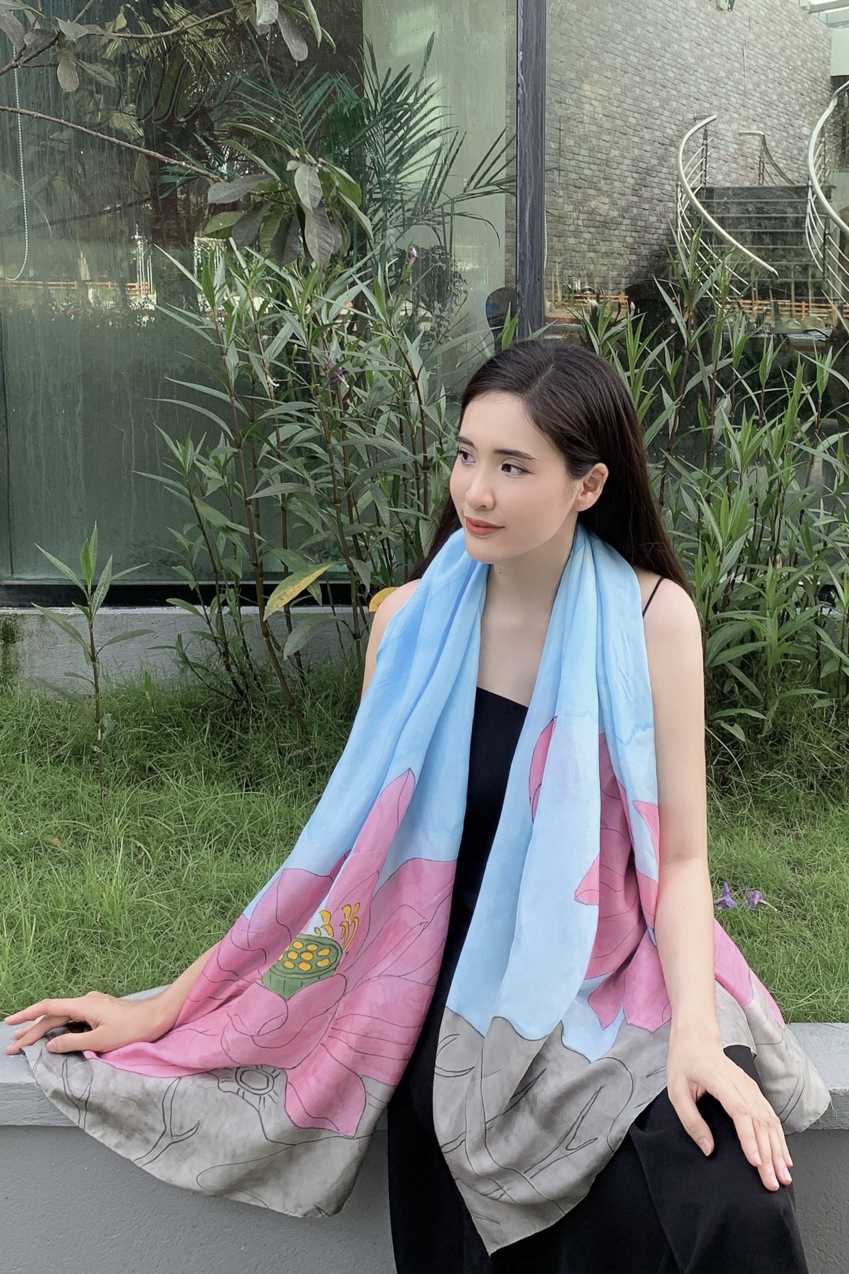 Khăn lụa tơ tằm dài vẽ tay hoa sen hồng là sự kết hợp hài hòa giữa chất liệu truyền thống và vẻ đẹp thuần khiết của thiên nhiên Việt. Trên nền lụa xanh mát lành, những bông sen hồng mềm mại bung nở – gợi lên hình ảnh người phụ nữ thanh tao, bản lĩnh mà vẫn dịu dàng.