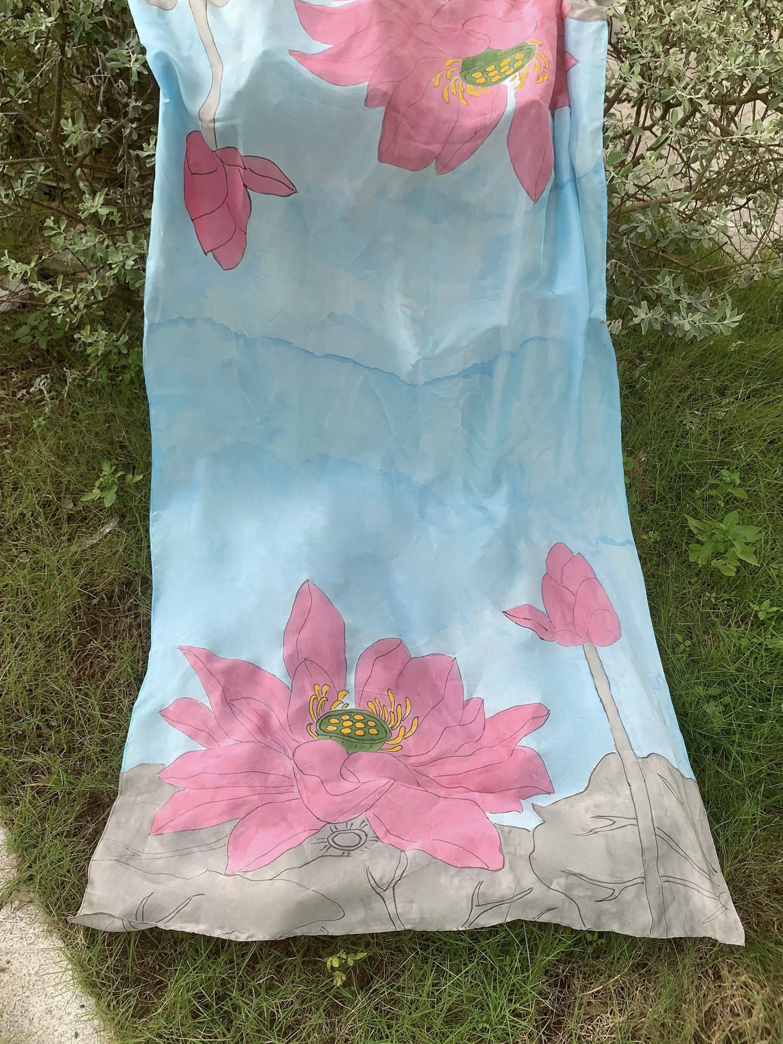 Khăn lụa tơ tằm dài vẽ tay hoa sen hồng trên nền xanh dịu mát, họa tiết độc bản, chất lụa Nha Xá cao cấp – món quà thủ công thanh lịch, mang đậm tinh thần Á Đông.