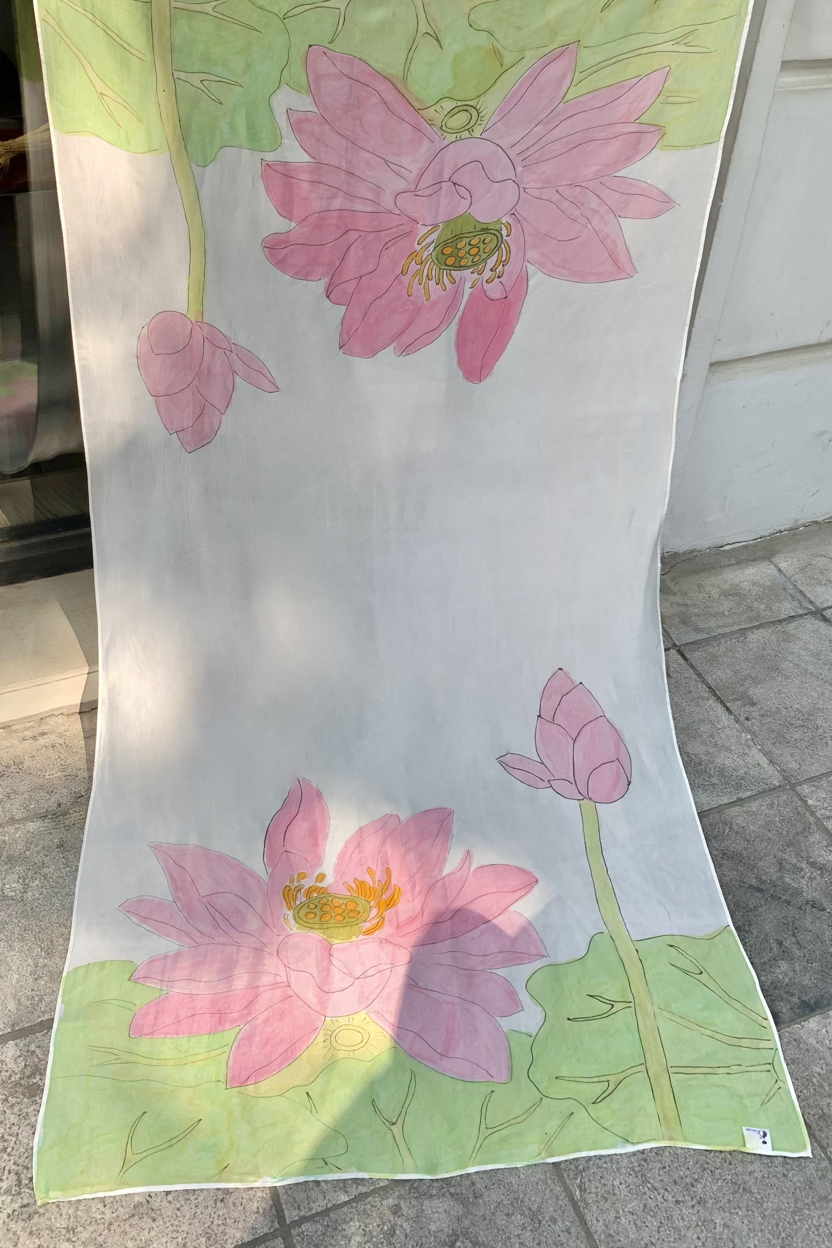 Khăn lụa tơ tằm vẽ tay hoa sen hồng – khăn lụa dài